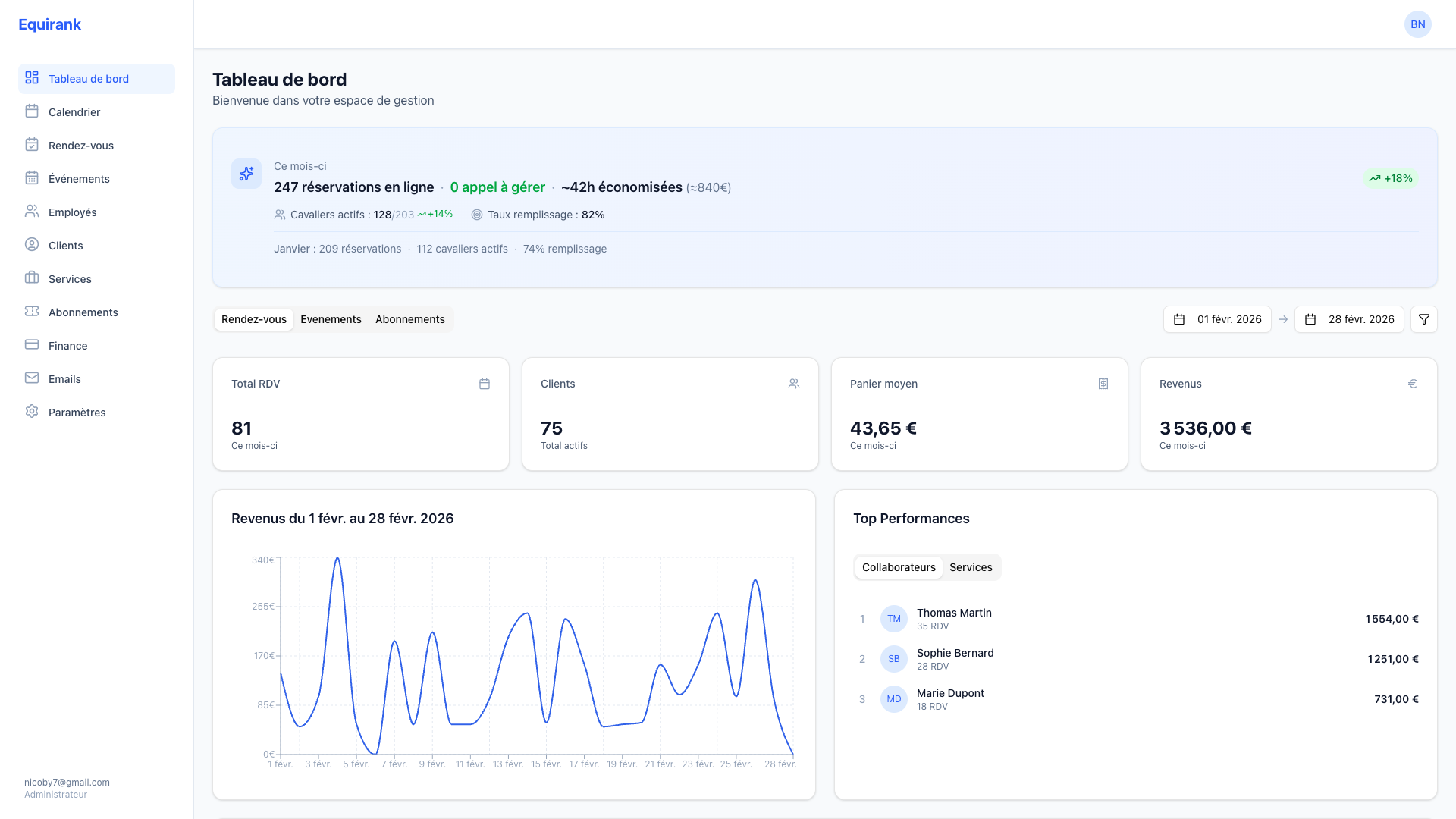 Réservations du jour, revenus du mois, taux de remplissage, temps économisé, comparaison avec le mois précédent. Tout sur un seul écran, accessible depuis votre téléphone.